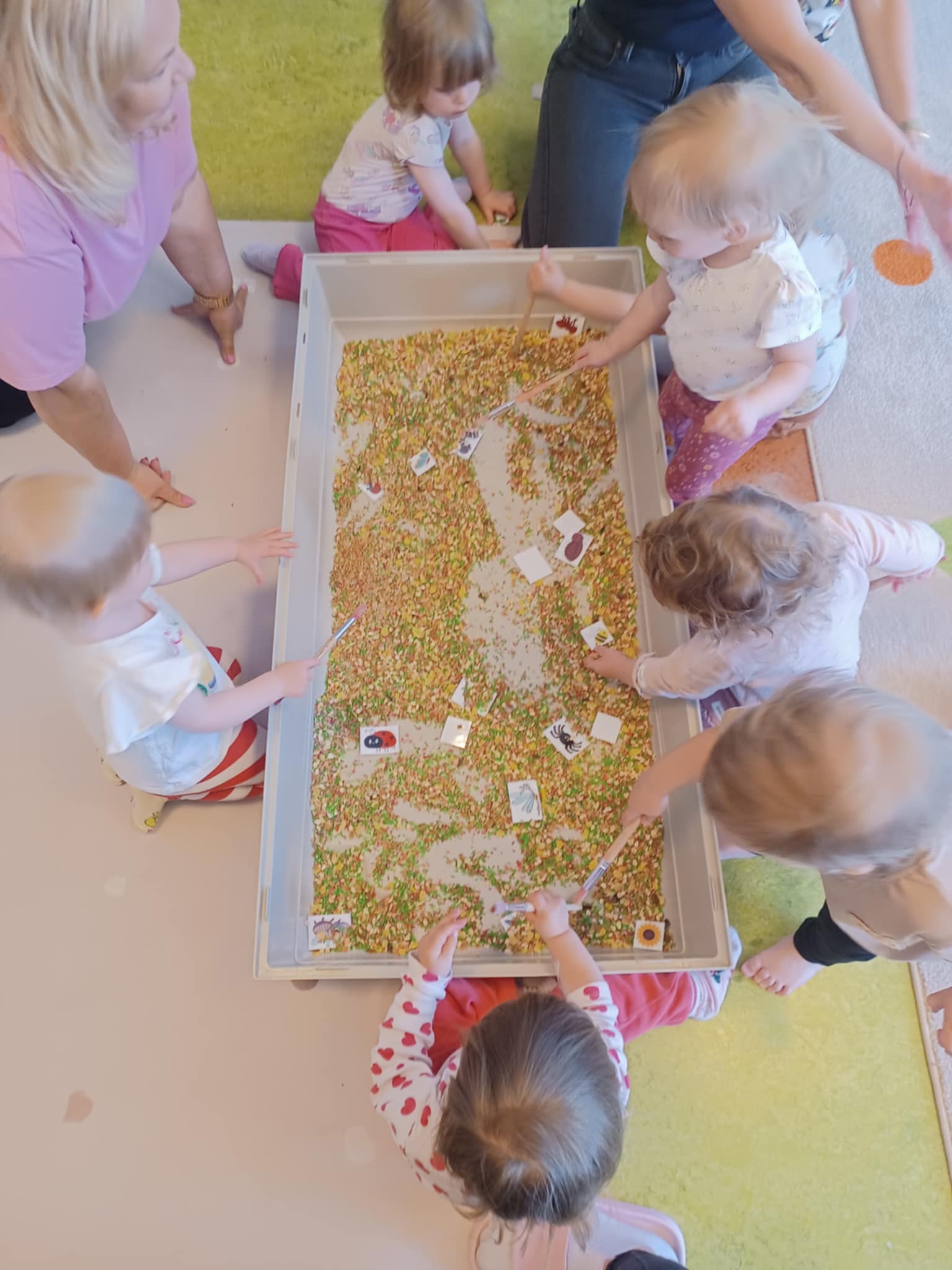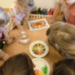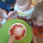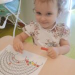 Eksperymenty z kolorami – maluchy obserwowały, jak barwy łączą się ze sobą, tworząc nowe odcienie. Zajęcia pobudzały ciekawość, uczyły przyczynowo-skutkowego myślenia i rozwijały zmysł obserwacji.