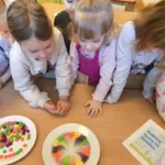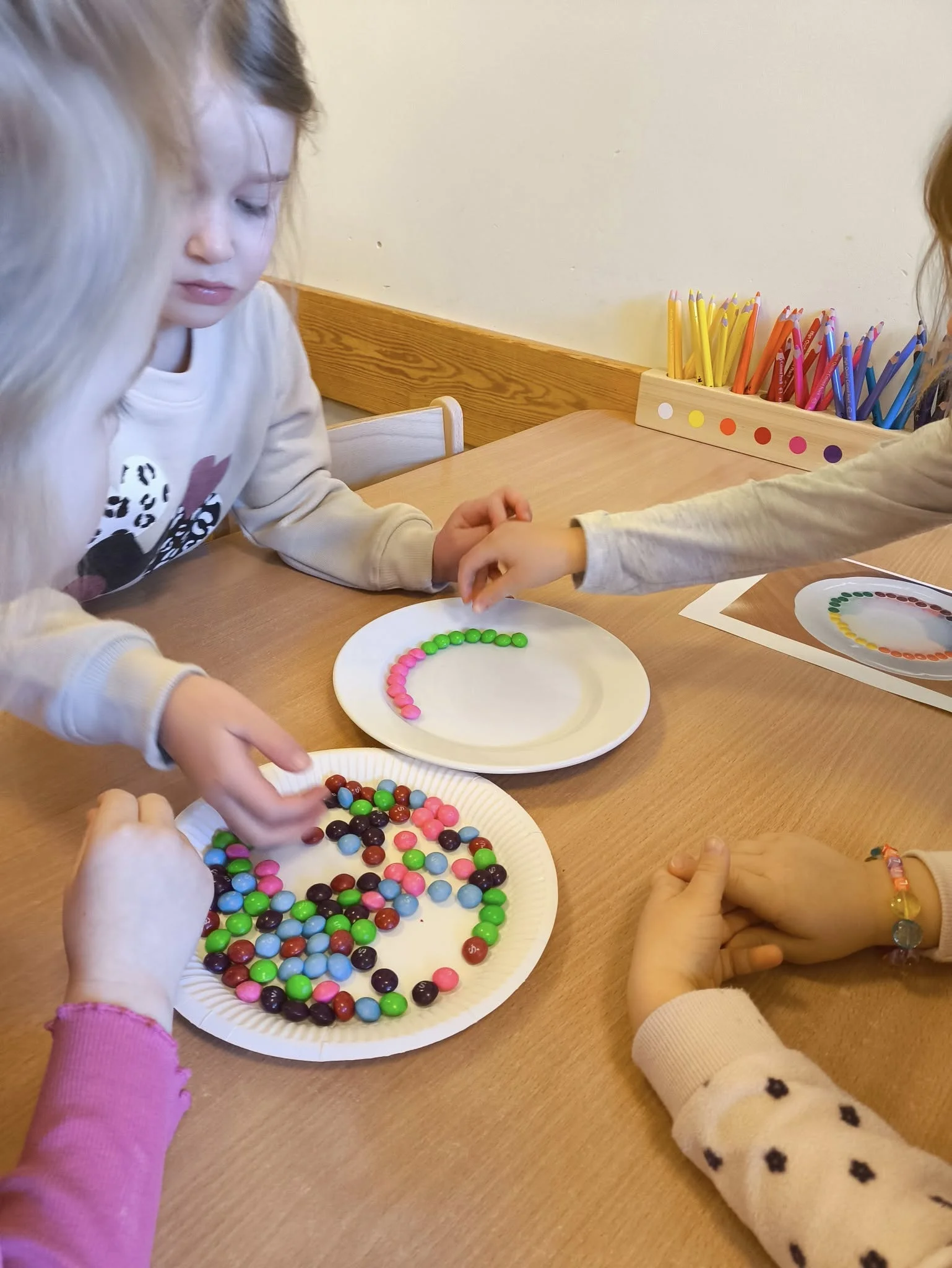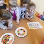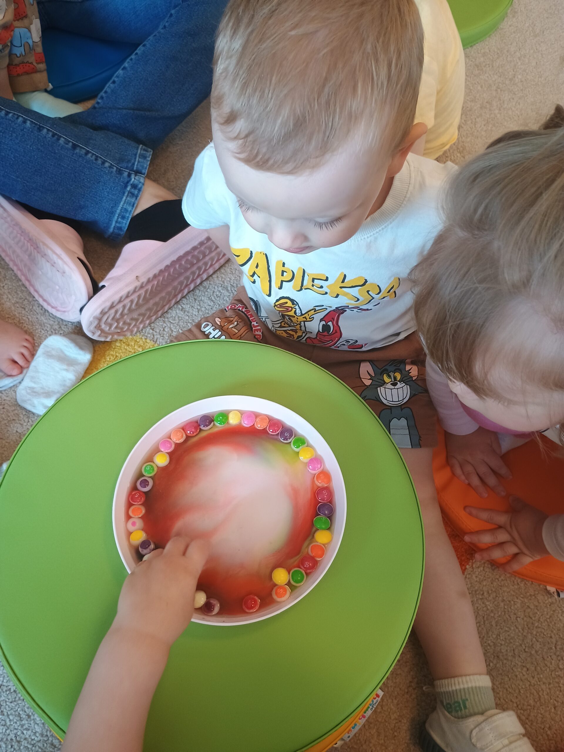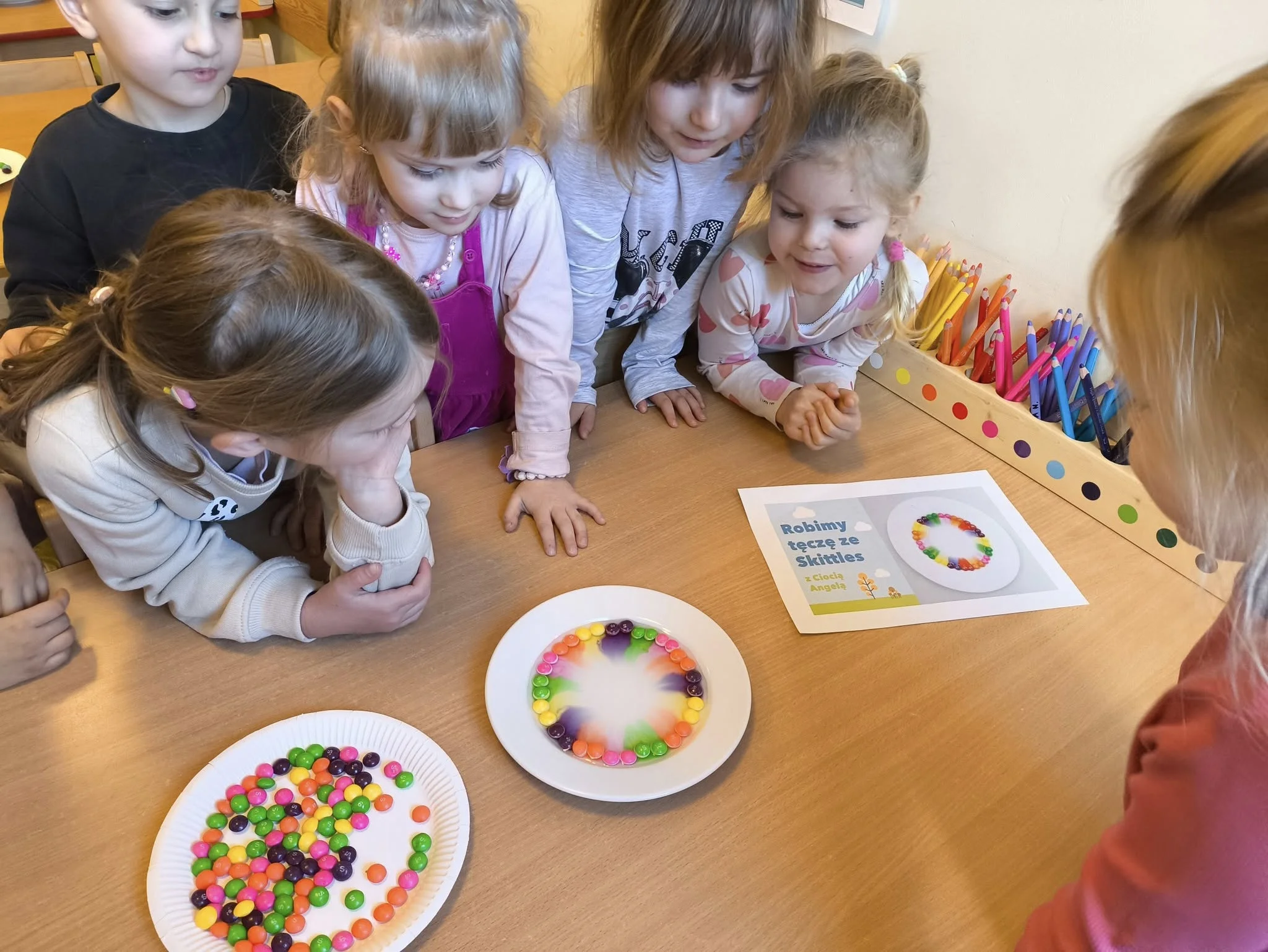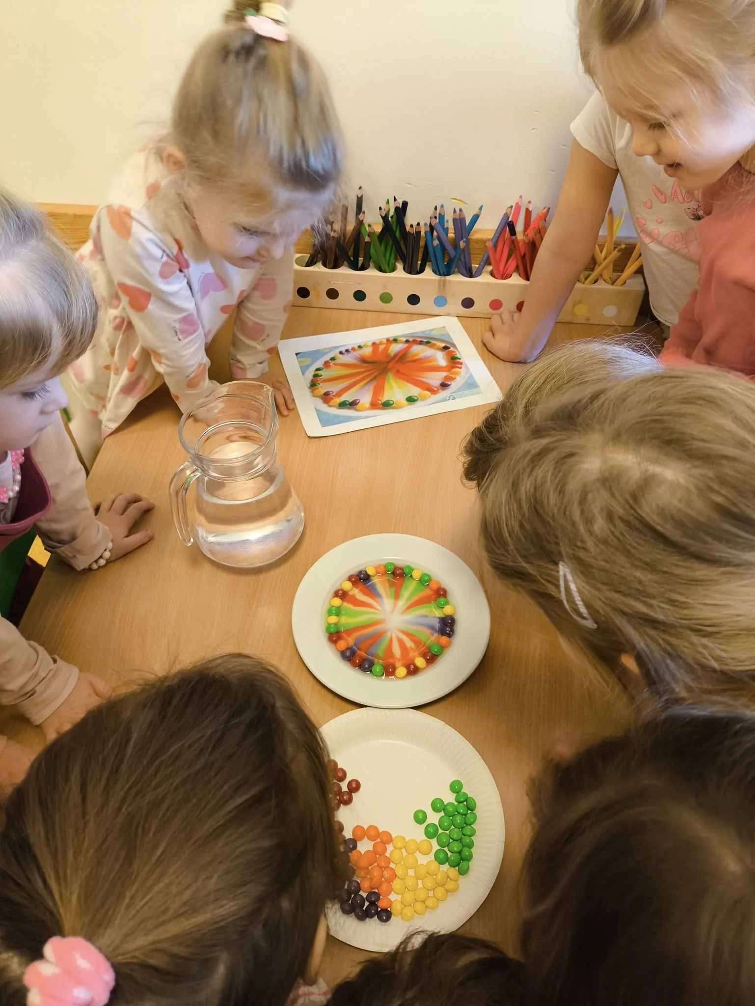 Z pomocą nauczyciela dzieci przeprowadziły proste, ale niezwykle efektowne doświadczenia z użyciem kolorowych cukierków i wody. Obserwowanie, jak barwniki rozpuszczają się i tworzą barwną mozaikę, wywołało ogromne zainteresowanie i radość. Eksperymenty zrobiły na przedszkolakach duże wrażenie i stały się świetnym punktem wyjścia do rozmowy na temat powstawania prawdziwej tęczy.