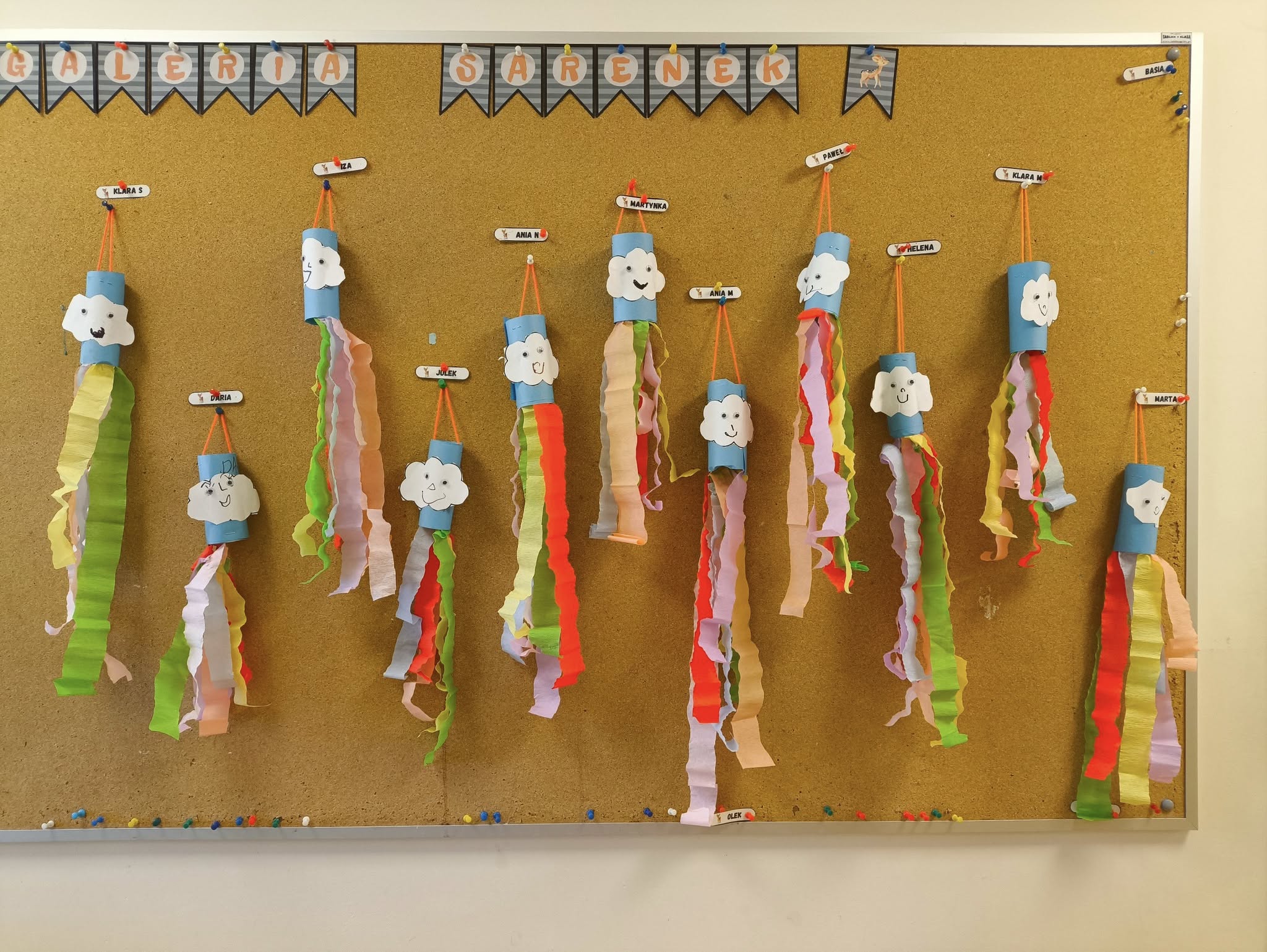 Zainspirowane działaniami dzieci chętnie dzieliły się swoimi spostrzeżeniami i zadawały pytania. Wspólnie z nauczycielem ustaliły, co jest potrzebne do powstania zjawiska tęczy w przyrodzie – słońce, deszcz i odpowiedni kąt padania światła. Aby utrwalić zdobytą wiedzę, Sarenki wykonały pracę plastyczną, przedstawiającą elementy niezbędne do pojawienia się tęczy na niebie.