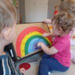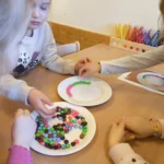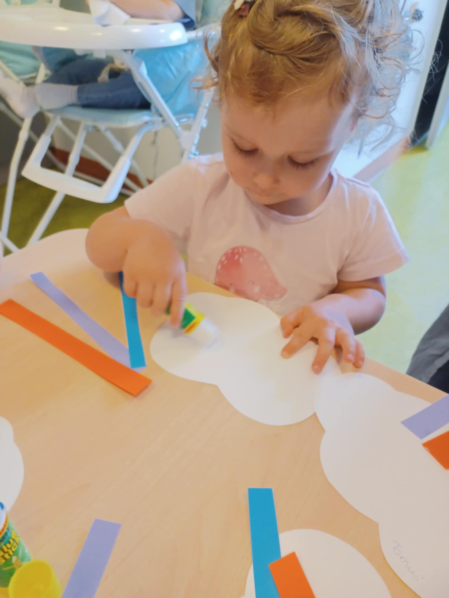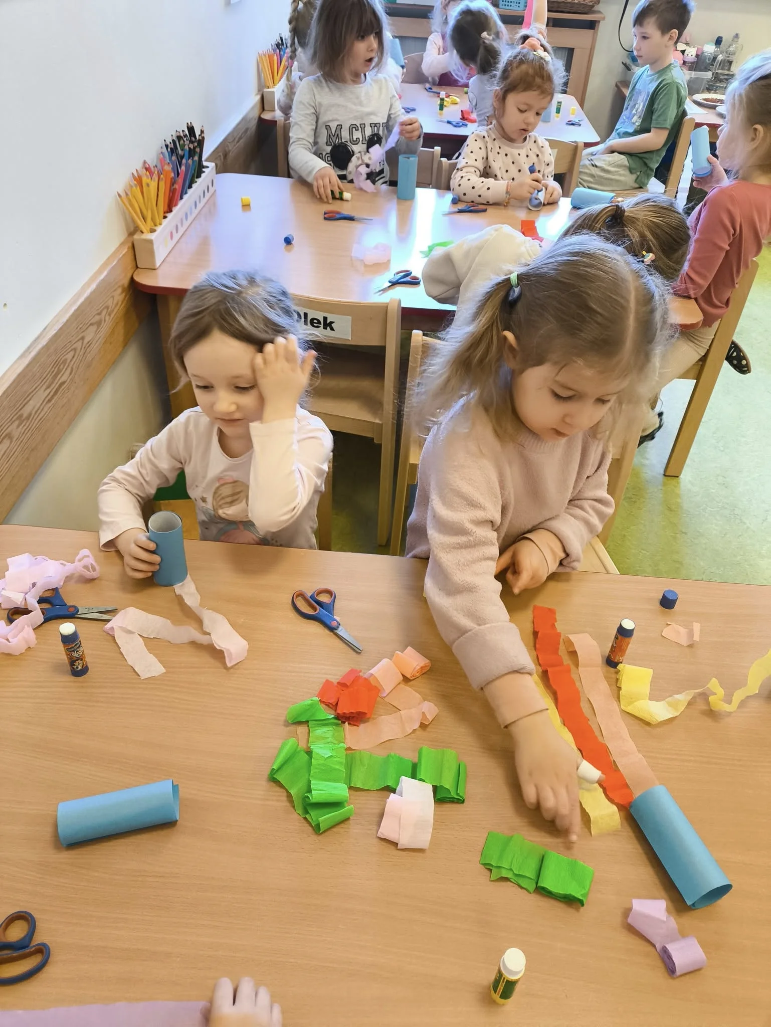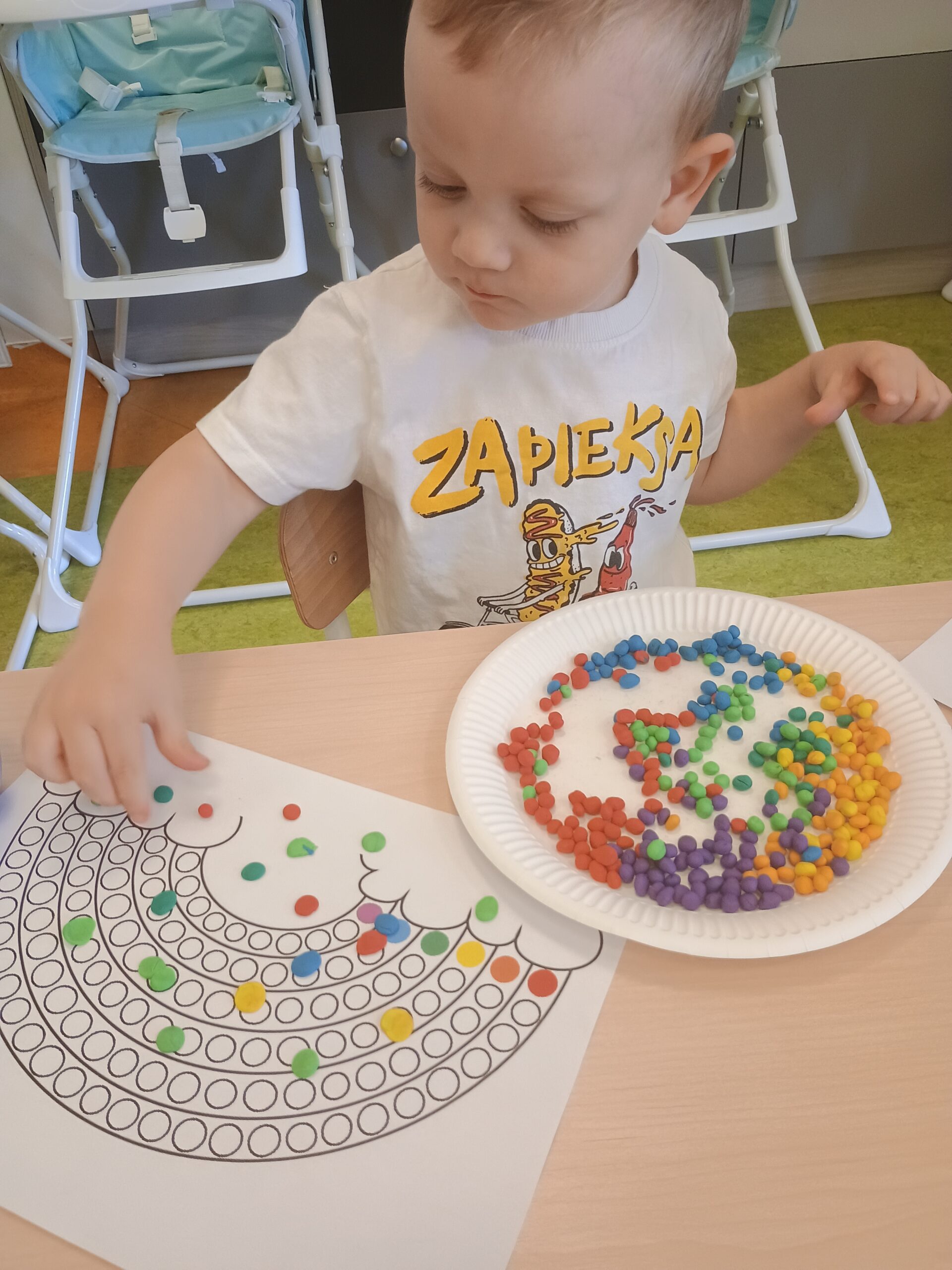 Aktywności manualne – dzieci wykonywały prace plastyczne inspirowane tęczą, używając bibuły, farb, plasteliny i papieru. Tego typu zajęcia wspomagają rozwój motoryki małej oraz kreatywność.