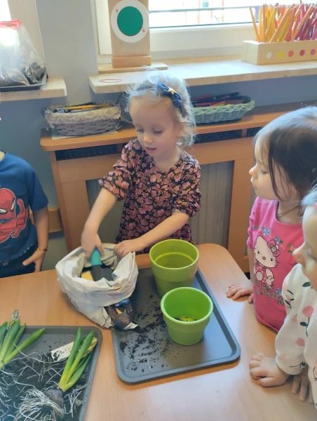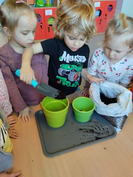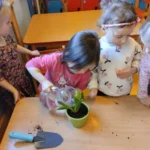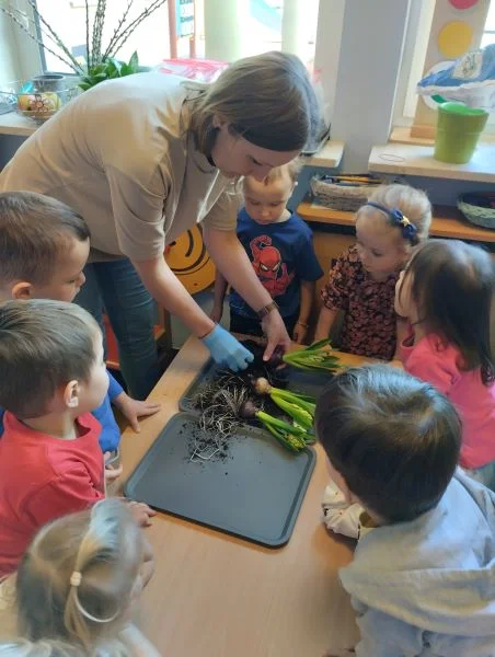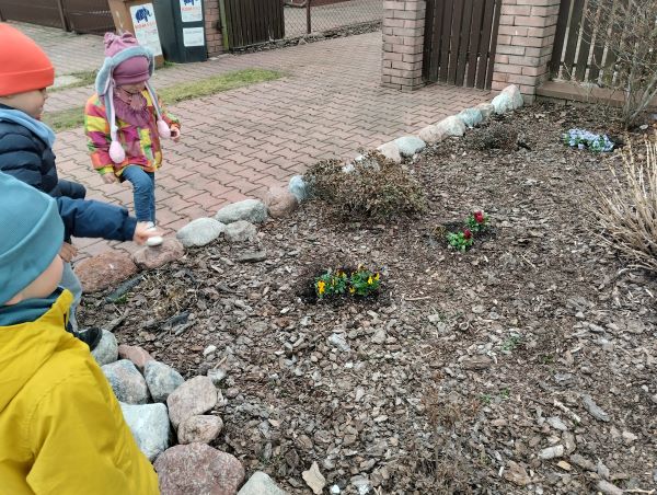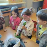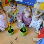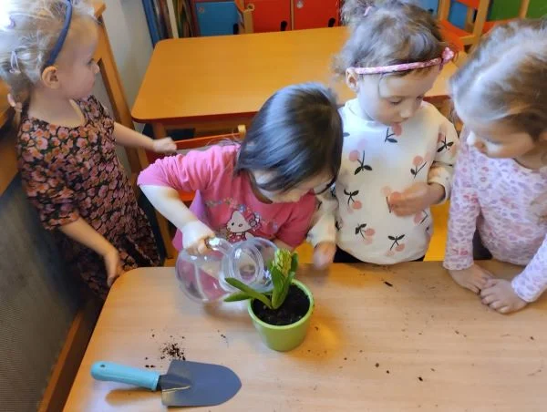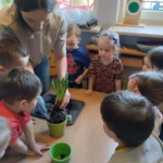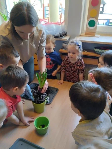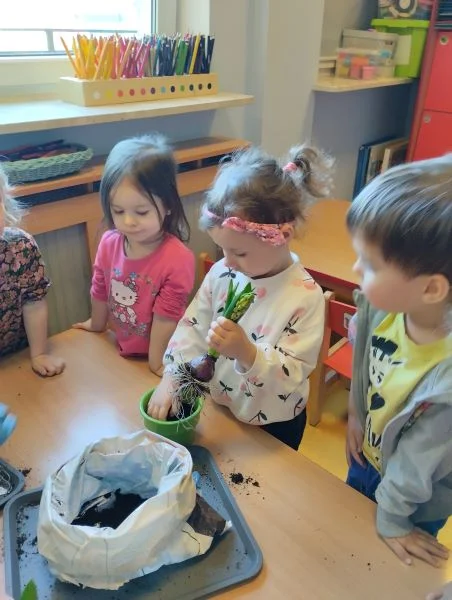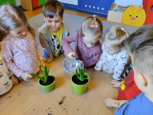 Po powrocie do przedszkola dzieci postanowiły zaprosić wiosnę również do swojej sali. Z ogromnym zaangażowaniem posadziły hiacynty, które teraz zdobią kącik przyrodniczy grupy. Wspólne sadzenie cebulek sprawiło przedszkolakom mnóstwo radości – były zachwycone możliwością samodzielnej pracy z ziemią i podlewaniem swoich kwiatków. Każdy maluch poczuł się odpowiedzialny za swoją roślinę i z dumą obserwuje jej codzienne zmiany.