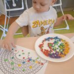 Ćwiczenia usprawniające koordynację wzrokowo-ruchową – dzieci miały okazję rozwijać sprawność poprzez zabawy z kolorowymi przedmiotami, układanki, sortowanie oraz zadania ruchowe angażujące wzrok i precyzję ruchów.